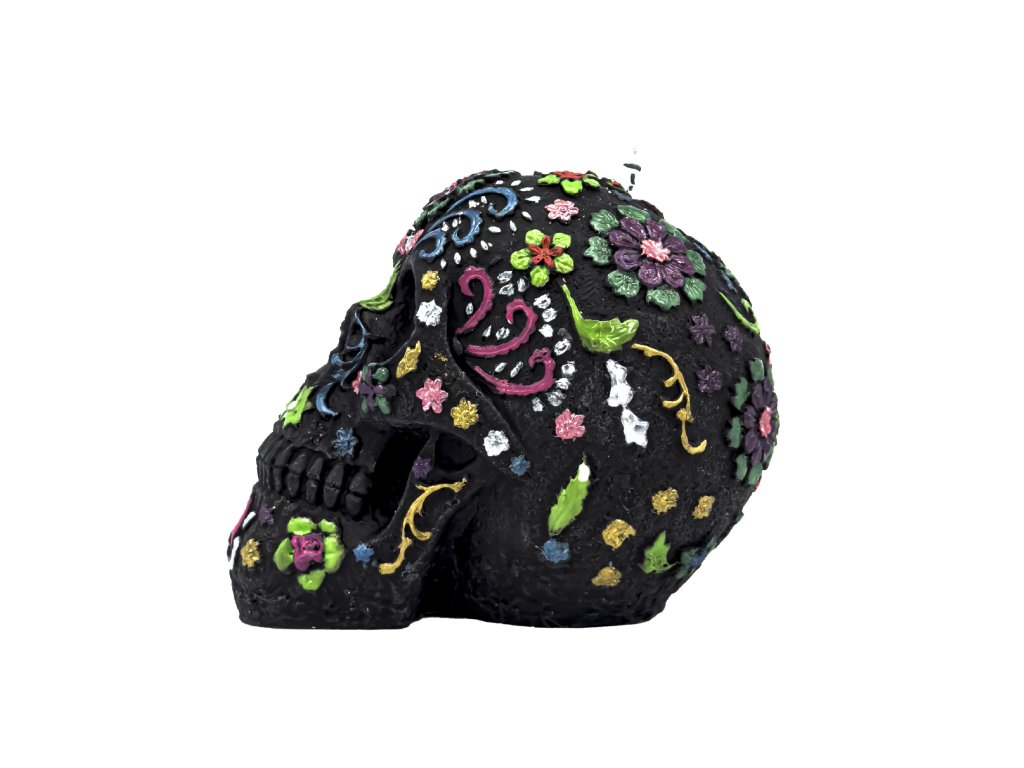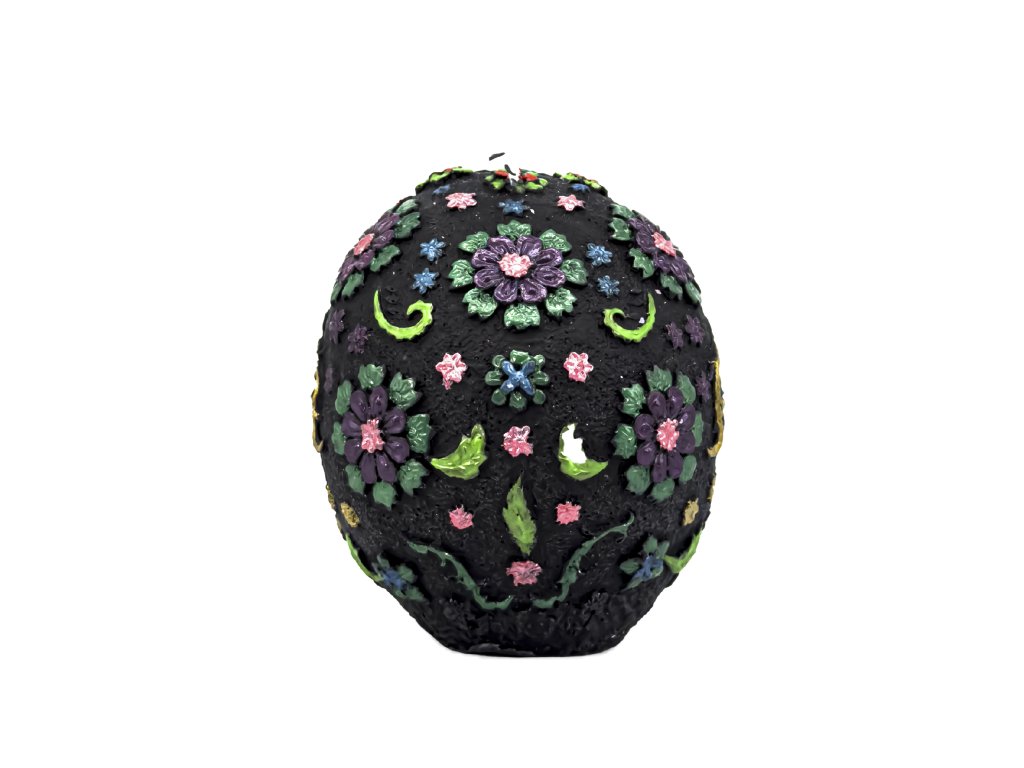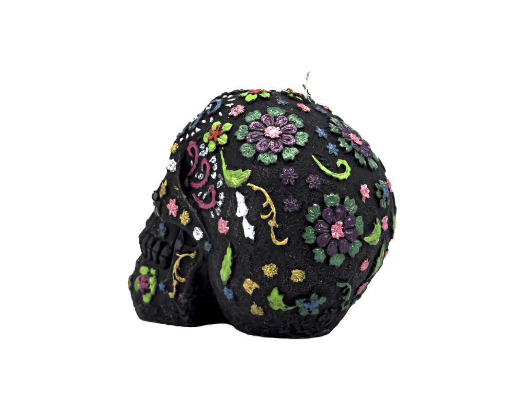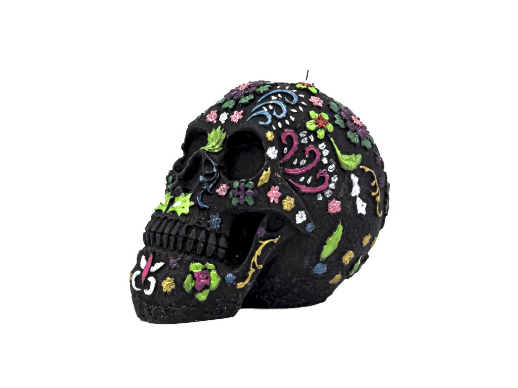 Svíčka Lebka Muertos Mexico černo-barevná 10 × 10,5 cm – mystická dekorace s duší pro rituály, oslavy a prostor s energií